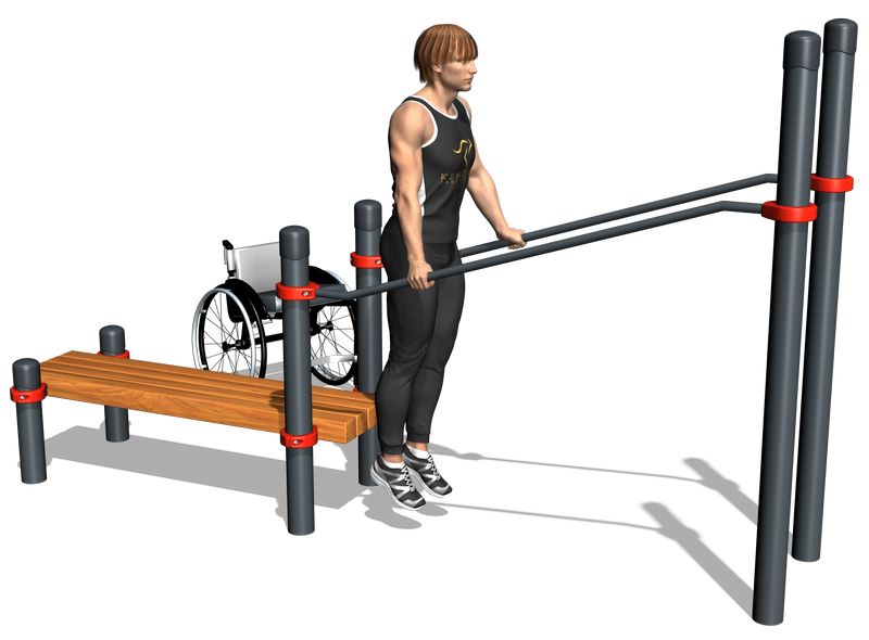 - Параллельные брусья в подъем. С помощью этого снаряда можно заново научиться ходить, а также отжиматься и подтягиваться. Высота опорных столбов отличается на 80 см: нагрузка плавно возрастает с каждым шагом, что является необходимым условием любого процесса восстановления. На брусьях смогут заниматься и инвалиды-колясочники, подтягиваясь вместе с коляской.