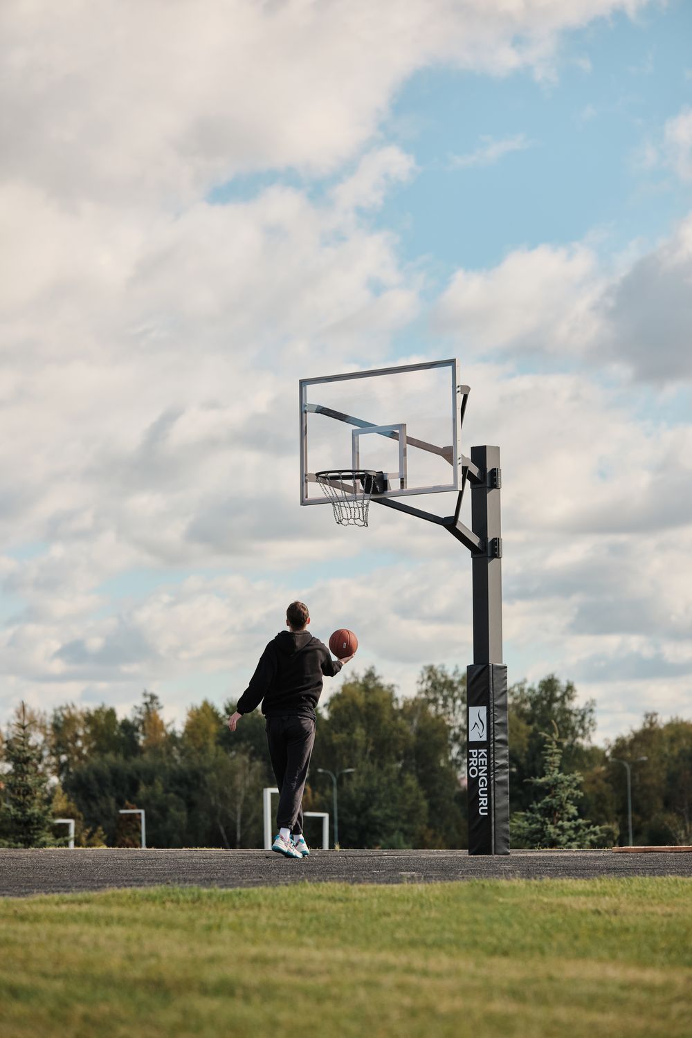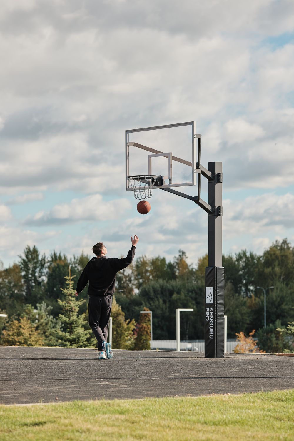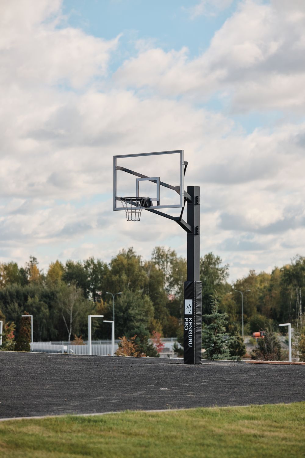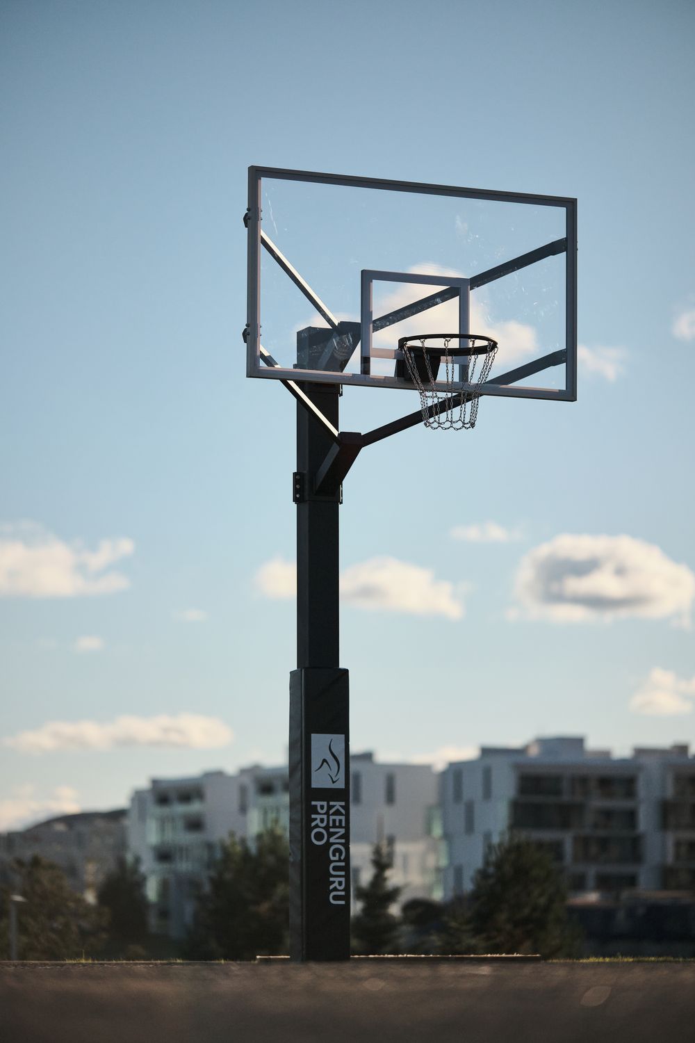 Баскетбольная стойка KENGURU PRO устанавливается на уличных баскетбольных или стритбольных площадках. Можно установить как в общественном пространстве, так и на частной территории. Стойка антивандальная: опорный столб сделан из металлического профиля 180х180 мм, толщина профиля 6 мм. Баскетбольный щит состоит из оргстекла, вставленного в алюминиевую раму. К щиту крепится баскетбольное амортизационное кольцо стильного чёрного цвета, вместо сетки — цепь. Чтобы смягчить случайный удар игрока о баскетбольную стойку на опорный столб устанавливается защитный протектор. Чехол протектора из ПВХ, наполнение — вспененный полиэтилен.