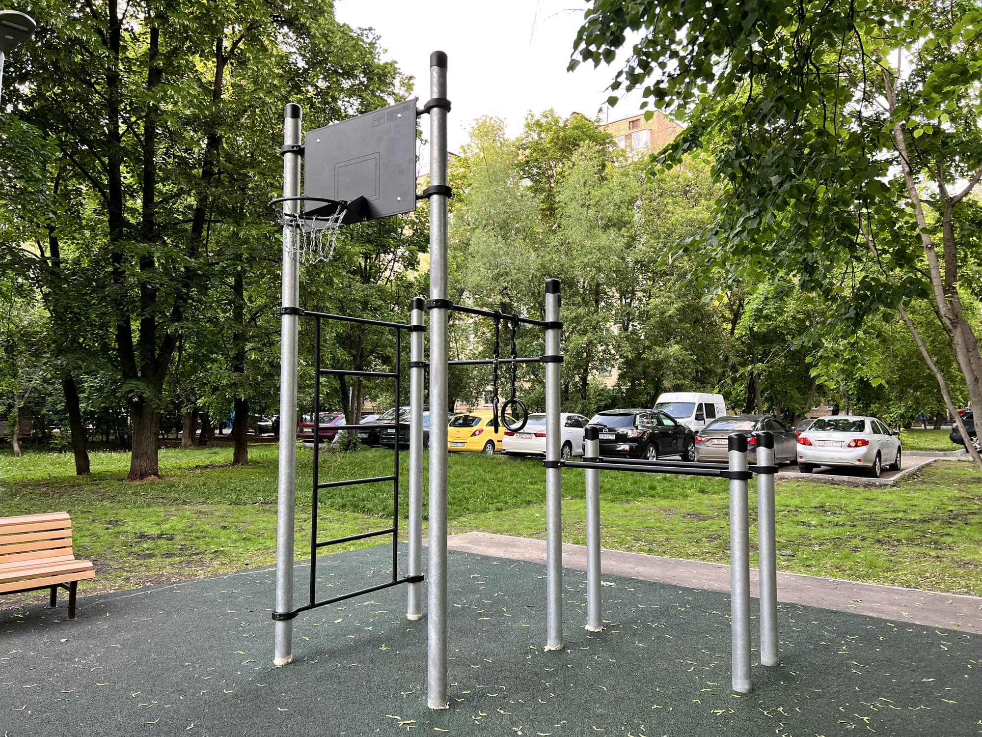 Воркаут комплекс подойдёт для установки на территории загородного дома или дачного участка. Здесь есть три турника, которые можно установить на разной высоте. Это удобно когда занимаются несколько человек и все они разного роста, например, мама, папа и дети. Дети обожают лазить по скалодрому и шведской стенке. Взрослые могут использовать шведскую стенку для стретчинга, различных приседаний и отжиманий. Также комплекс укомплектован баскетбольным щитом: можно в одиночку побросать мяч у в кольцо, а можно собрать команду и поиграть в стритбол*.