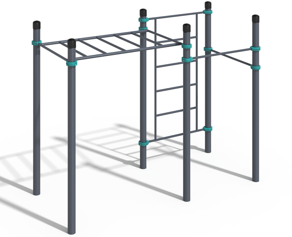Комплекс состоит из шести опорных столбов высотой 2600 мм, рукохода, шведской стенки и двух перекладин для подтягиваний длиной 1200 мм. Элементы крепятся к опорным столбам при помощи хомутов. Высота фиксации перекладин для подтягиваний: 1 шт. - 1800 мм, 1 шт. - 2100 мм. Шведская стенка крепится на высоте 2450 мм. Состоит из перекладин, расстояние между которыми 373 мм. Высота шведской стенки - 2073 мм, ширина - 1200 мм. Высота фиксации секции рукохода: 2300 мм, длина секции 1900 мм, шаг рукохода 310 мм. Длина комплекса не более 3300 мм.