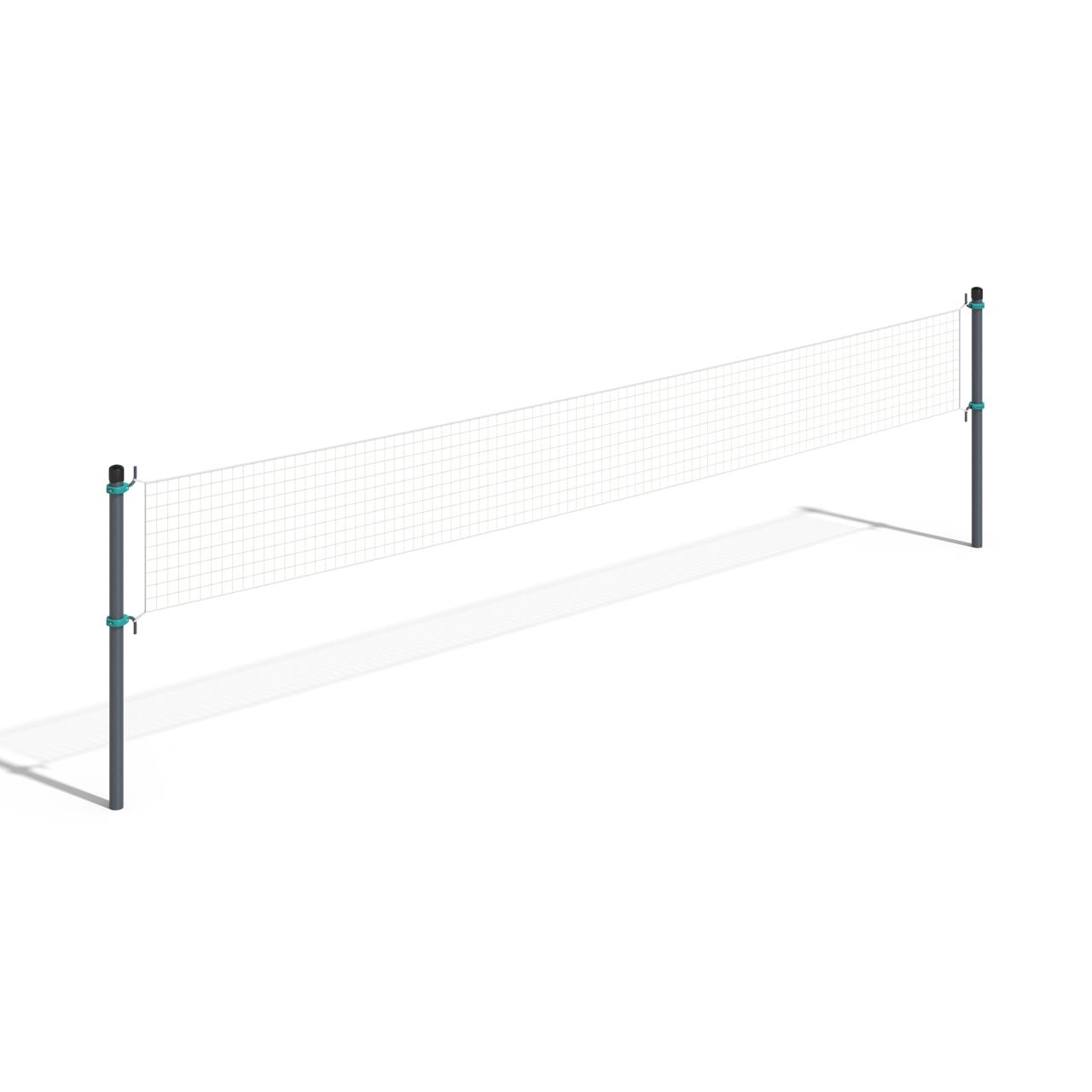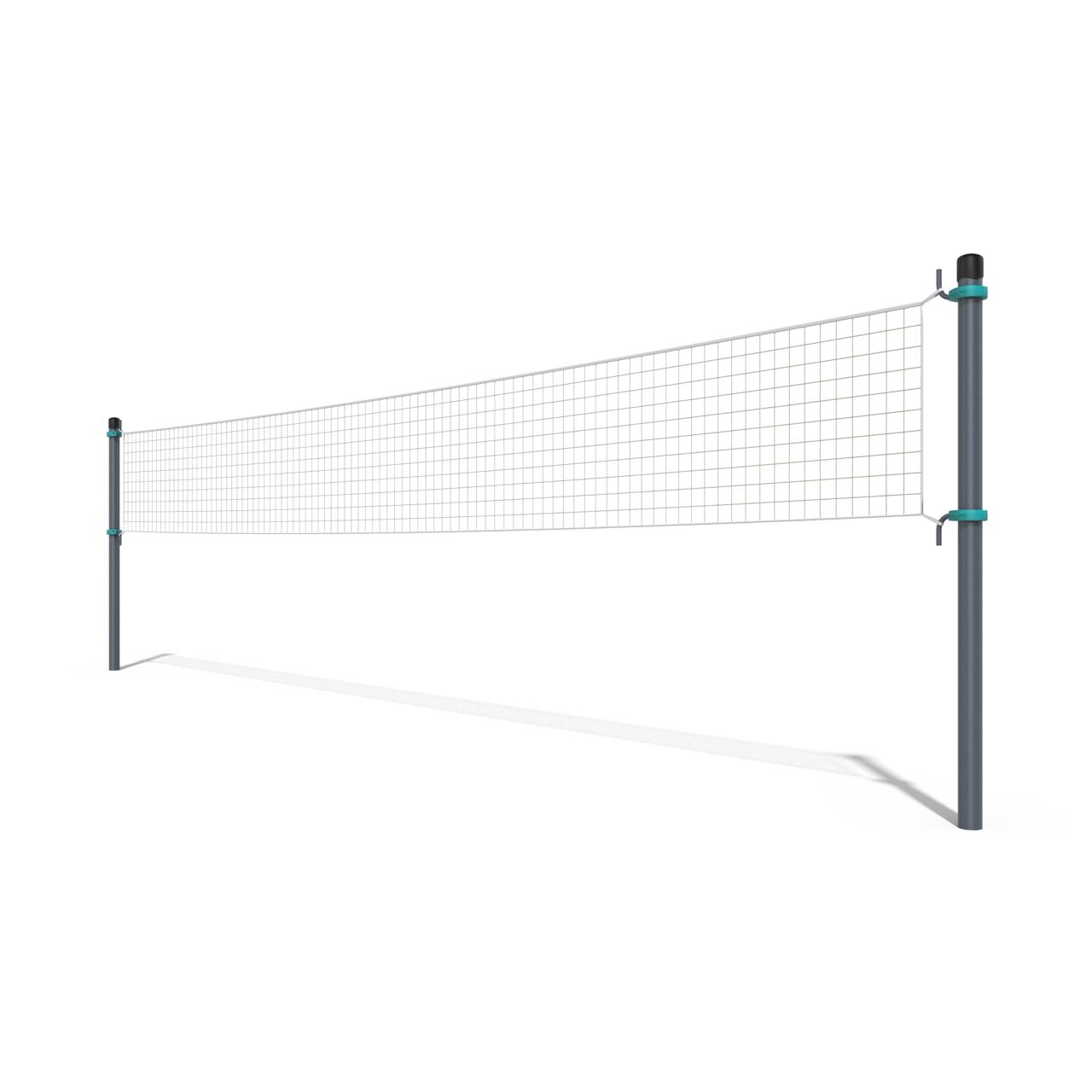Стойки это два опорных столба высотой 2,6 метра с натянутой между ними волейбольной сеткой. Сетка крепится к опорным столбам при помощи силуминовых хомутов и стальных крюков. Опорные столбы это металлические трубы диаметром 108 мм и толщиной 3 мм. Они бетонируются на глубину 700 мм. На каждом столбе сверху установлена заглушка из ударопрочного AБC пластика.