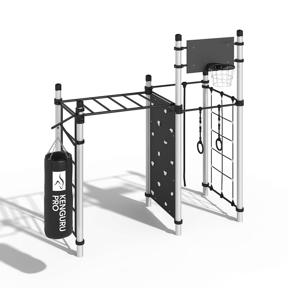Бакрес (Алюминий) - 2 турника, рукоход, шведская стенка, скалодром, канатная сетка, баскетбольный щит, боксерский мешок, кольца и канат